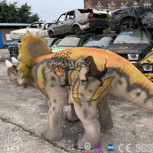 In Dinosaur theater show, the juvenile Triceratops costume performer needs to hop in underneath kind of in the stomach area step his feet into these back legs which are like shoes get yourself strapped in around the waist shoulders and around the thighs, then snap on the helmet supporting you lift Triceratops's head up and down,  and then position the body right above these enormous tilts and in front so Dinosaur suit actor's arms are walking on arm stilts,  in the back primal likes like shoes. It's just like a walk on all fours.