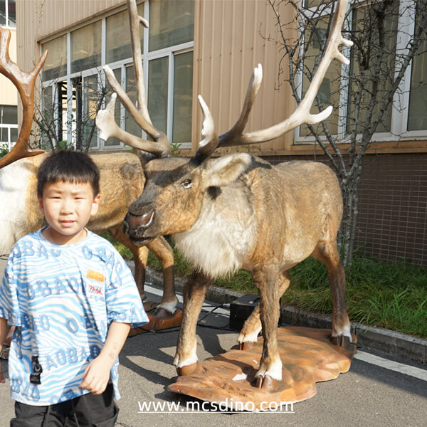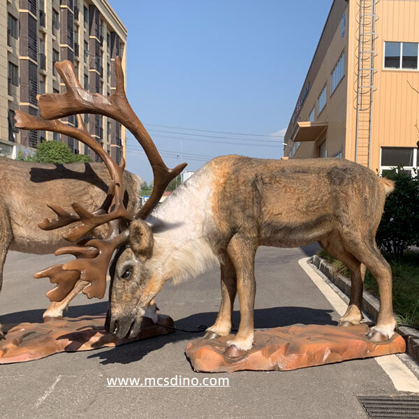This set of elegant animatronic caribous is a custom request from our Australian client. The scene design of this group of animatronic animals is divided into two reindeer with different physiques, one is fatter, with its front feet on the ground anxiously, asking people for food, and the other is slightly thinner, it is lowering its head to graze, raising its head alertly from time to time. Look around. The appearance and movement of these two reindeer are very realistic and suitable for Christmas landscape decoration. It will make the whole space lively and full of agility.