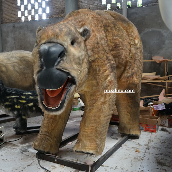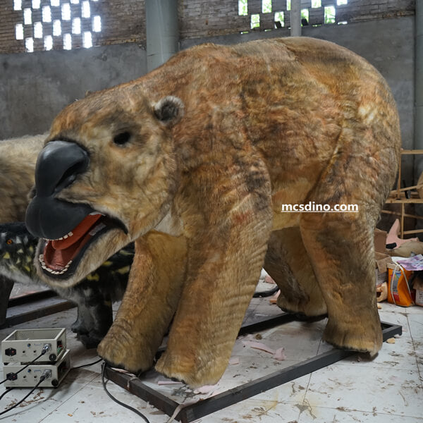 The Diprotodon animatronic animal built by MCSDINO is a life-like Robotic Diprotodon, about 3 meters long and 2 meters high at the shoulder. The double incisor is the largest marsupial found in Australia. It may be affected by thylacine, marsupial lion, ancient monitor lizard Invasion in ice age. We relied on actual paleontological restoration maps, carved an oval head in the sculpture, and implanted artificial hair all over the body. In the action, let it extend its front paws so that the whole prehistoric animatronic animal model looks very vivid.