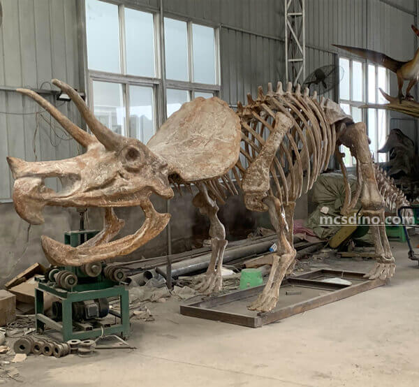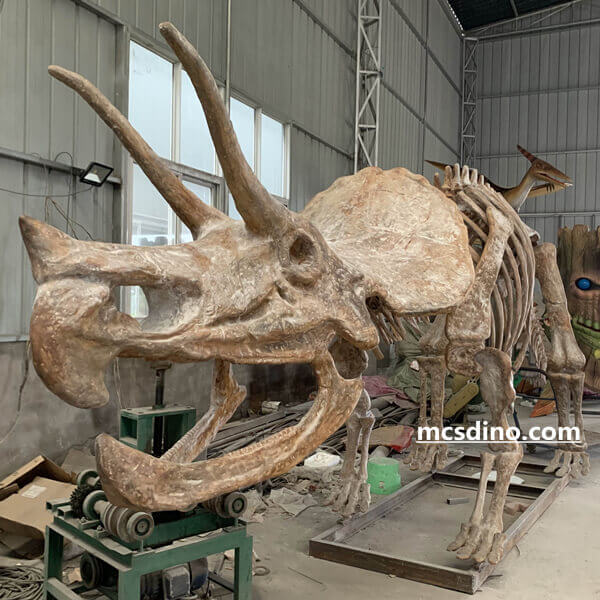 The Triceratops fossil replica is a 7-ft tall, 26-ft long replica. It is made from fiberglass materials, with each bone painstakingly crafted and assembled on a steel frame. This impressive work of art can be found in children's museums and science centers, creating a wondrous effect as it transports guests to a time of prehistory.