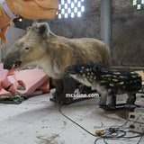 Make an animatronic model of a prehistoric giant tapir. Its appearance is similar to today's tapir, but Megatapirus is much larger. Prehistoric giant tapirs lived in the tropical rain forests of Guangxi, China. Two giant tapirs, one large and one small, appeared in the forest. On the sculpting Tapir animatronic part, Unlike the adult giant tapir, the dark gray body of the small giant tapir is covered with white spots and stripes. The head of the giant tapir is like a pig, with a pair of small eyes and two small ears. When debugging mechanical movements, we made interesting adjustments to the nose movements.  The nose of Tapir animatronic's movements are very flexible and can be curled like a mini elephant nose.