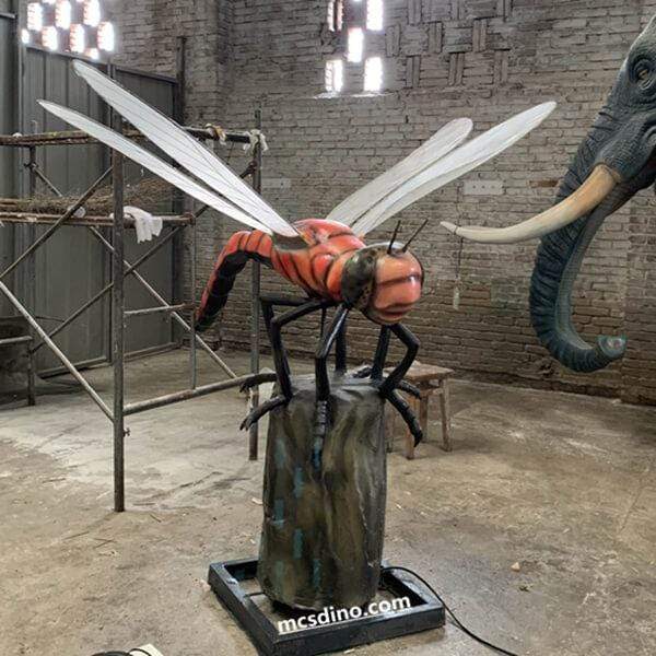 El equipo de MCSDINO construyó con éxito este modelo animatrónico de libélula gigante, Meganeura, la criatura prehistórica. Todo el diseño de la escultura cinética de la libélula gigante roja es muy vívido. La escena muestra a la libélula descansando sobre el tocón de un árbol, batiendo suavemente sus alas y girando ligeramente la cabeza para mirar a su alrededor. Los turistas están aquí para regresar al mundo prehistórico.