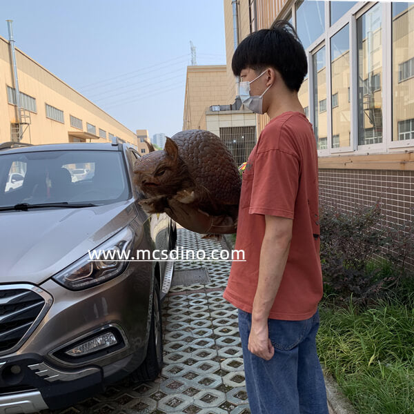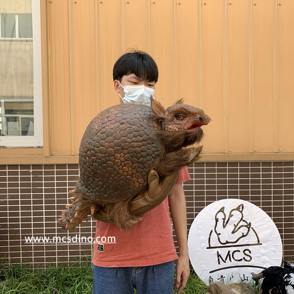 Prenant le bébé Glyptodon dans vos bras, notre accessoiriste a d'abord pensé à l'apparition du Glyptodon dans la réalisation de cette marionnette animalière. Après que la forme de base ait été sculptée avec une éponge haute densité, un petit fer à souder a été utilisé. Des centaines de ces morceaux d’os hexagonaux sont représentés comme des armures dures. Afin de mieux faire fonctionner les mouvements des yeux et de la bouche pour s'insérer dans l'espace étroit de la petite tête de l'hélice Glyptodon, la partie de commande mécanique interne est spécialement conçue. Cette figurine à main Glyptodon est un autre personnage intéressant de la série de marionnettes à main MCSDINO Ice Age Animal.