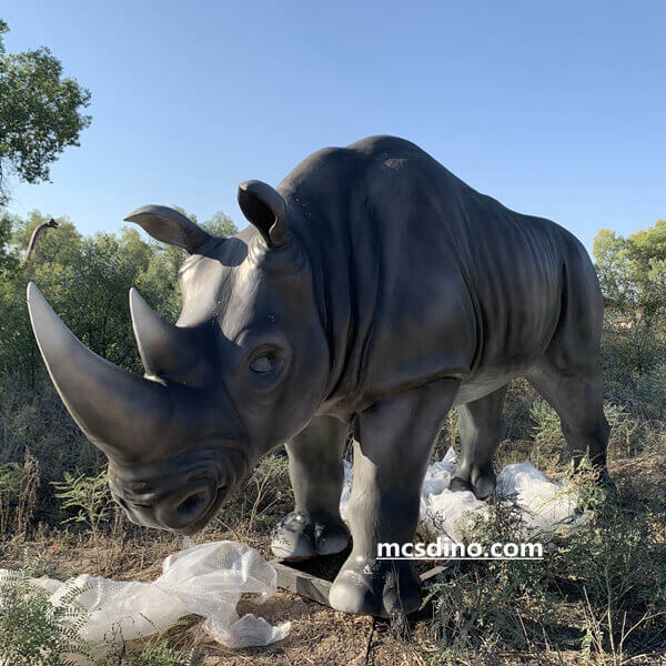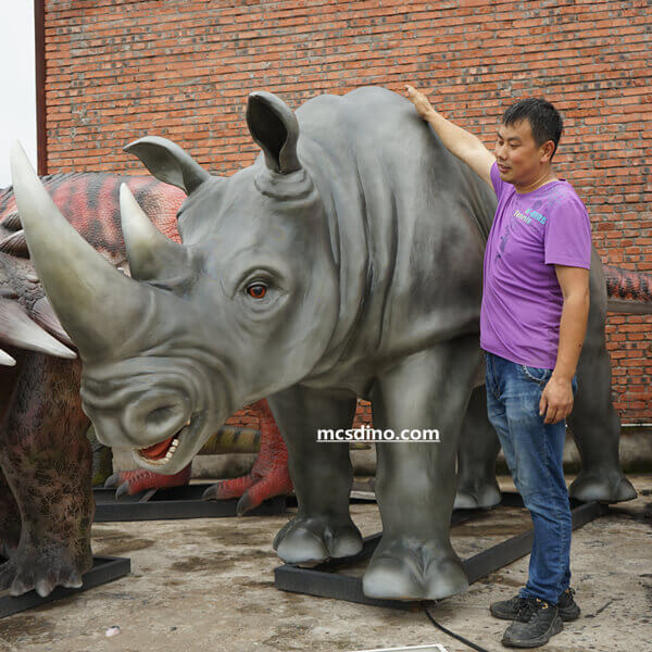 Animatronic rhino animal robot carved in high-density foam and silicone. This life-size rhino model was painted with airbrushing by MCSDINO artists. We firstly built a metal structure with stainless coating as rhino's skeleton and programmed electric systems. Easily for you use WIFI to program the movements According to your needs. The rhinoceros model is very suitable as an exhibit in the zoo. When people get close, it will trigger its action to start working.