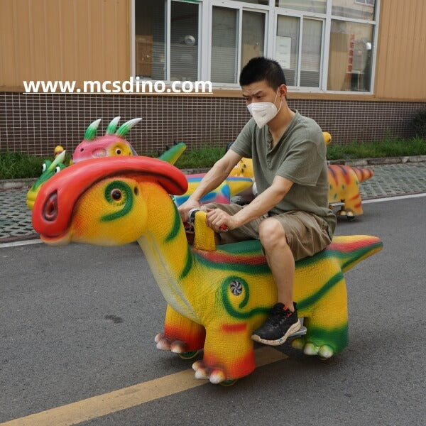 The cute shape of the Parasaurolophus car attracts children. Who doesn't love these cute dinosaur cars? The customer asked us to make the characteristics of dinosaurs cute so that the shuttle dinosaur scooter has bright colors and eye-catching markings. The flashing led lights on the body make children full of fun in the process of riding and sliding.